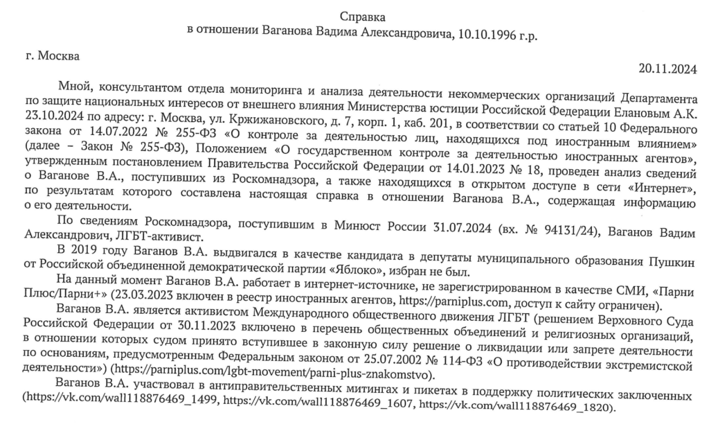 Главный специалист отдела по делам некоммерческих организаций Минюста Дмитрий Смирнов составил протокол по ст. 19.34 КоАП. Причина — Вадим Ваганов публиковал посты в своем телеграм-канале и работал в издании «Парни+» и при этом не попросил включить себя в реестр «иноагентов». Дмитрий Смирнов самостоятельно не изучал соцсети Ваганова, а лишь скопировал информацию из отзыва Минюста, который тот предоставил в суд в ответ на иск Ваганова об оспаривании внесения в реестр «иноагентов».