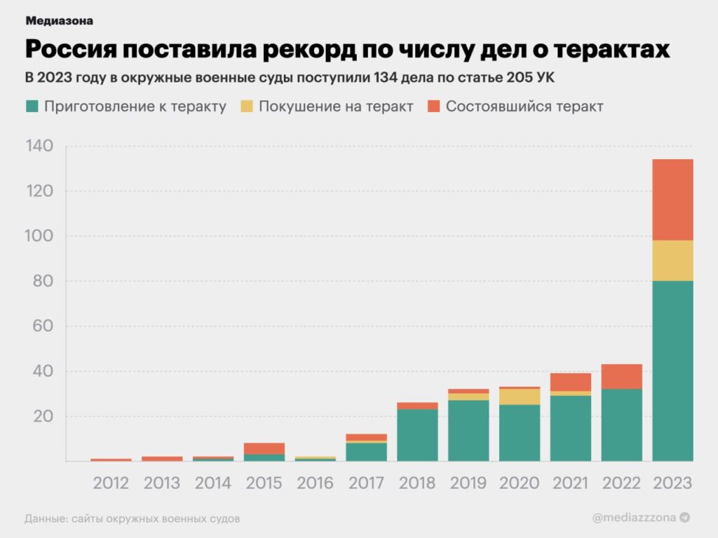 «Медиазона» подсчитала, что в 2023 году в суды передали 134 дела по основной статье о теракте. Это в три раза больше, чем годом ранее.