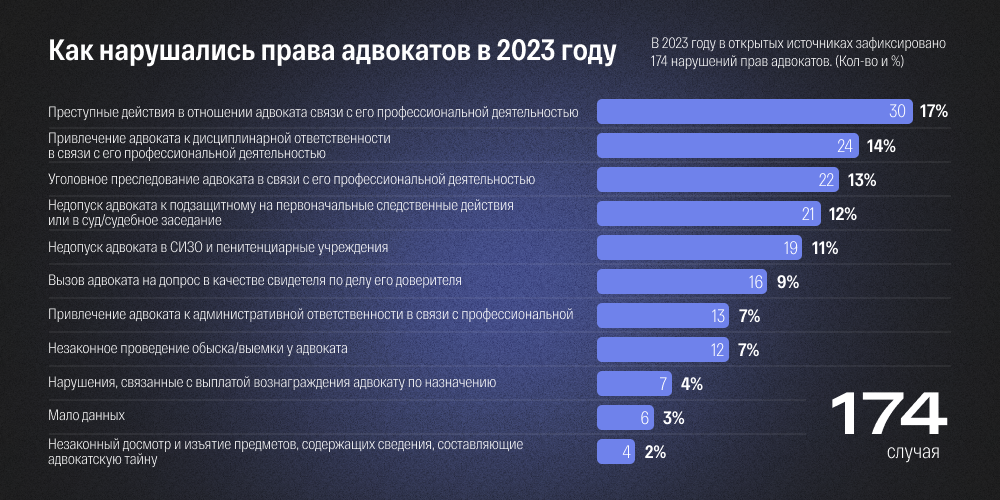 «Первому отделу» удалось проверить и подтвердить информацию о 174 нарушениях прав адвокатов в 2023 году.
