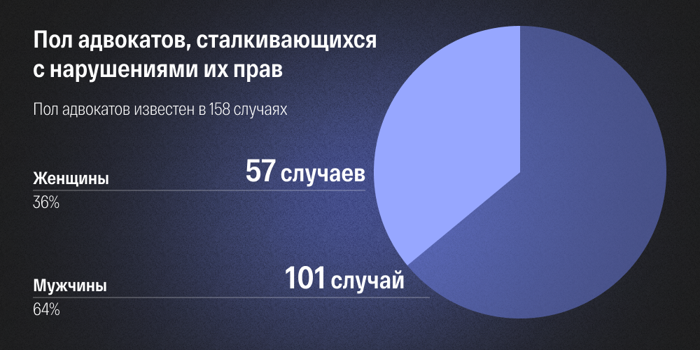 Мужчины адвокаты сталкиваются с нарушением профессиональных прав почти в два раза чаще чем женщины — 64% против 36%. Адвокатов мужчин чаще привлекают к уголовной ответственности — 16% против 7%. Оговоримся, что нам известен пол защитников только в 158 случаях из 174. Также, по данным Минюста, адвокатов мужчин в России в принципе больше, чем женщин — 58,5% против 41,5%.