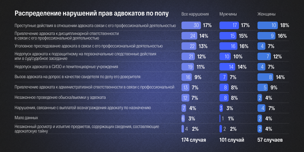 При этом преступные действия против адвокатов направлены в равной мере против мужчин и женщин (17% и 18% соответственно), и данное нарушение находится на первом месте среди обеих категорий.