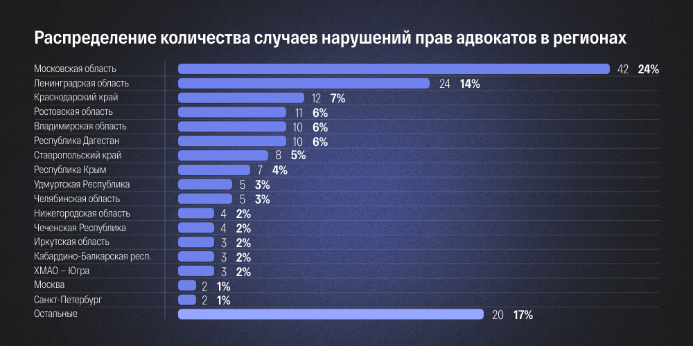 Южные регионы (Краснодарский край, Ростовская область, Республика Дагестан, Ставропольский край, Республика Крым) собрали в общей сложности 28% нарушений. В каждом из них было совершено от 4% до 7% нарушений. Похожие цифры продемонстрировала Владимирская область — 6%. В остальных регионах отмечено 3% и менее нарушений прав адвокатов в связи с их профессиональной деятельностью.