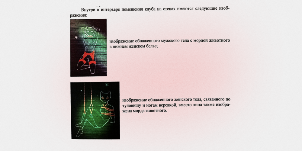 Первые проблемы с такими заведениями в Кирове начались с нас. 13 января 2024 года (согласно решению суда, старший лейтенант полиции Ерошкин А.В. составил протокол 19 января, — Прим. «Первого отдела») к нам пришли сотрудники УМВД и написали на нас заявление за то, что мы занимаемся «ЛГБТ-пропагандой». В марте Октябрьский районный суд признал нас виновными и назначил штраф в 500 000 рублей. В решении суда в качестве доказательства «пропаганды ЛГБТ» было указано несколько моментов: на стенах бара были нарисованы люди с кошачьими головами, на одном из них была портупея, один из выступающих артистов заявлял о себе в СМИ как об открытом гее, во время составления протокола на камеру сотрудников попал поцелуй двух мужчин — гости были пьяными, мы общались с полицией, поэтому они были предоставлены сами себе. Позже этих мужчин оштрафовали. Одного на 50 000 рублей, второго на 25 000.