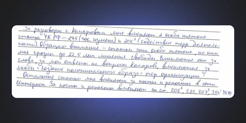 Из-за разговоров с Комаровым мне вменяют две особо тяжкие статьи УК РФ — 275 (госизмена) и 205.1 (содействие террористической деятельности). Обращаю внимание, это особо тяжкие статьи, по ним мне грозит до 22,5 лет лишения свободы. 22,5 года за ответы на вопросы Комарова, за якобы «создание положительного образа» террористической организации.