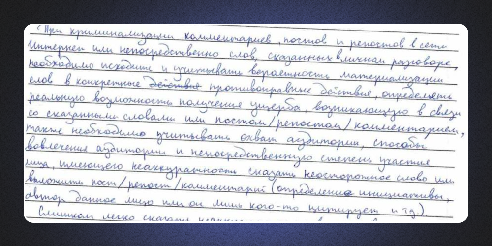 При криминализации комментариев, постов, репостов и частных разговоров, необходимо исходить и учитывать вероятность материализации слов в конкретные противоправные действия, определять реальную возможность получения ущерба, возникающего в связи со сказанными словами или постом/репостом/комментарием, также необходимо учитывать охват аудитории, способы вовлечения аудитории и непосредственную степень участия лица, имеющего неаккуратность сказать неосторожное слово или выложить пост/репост/комментарий.