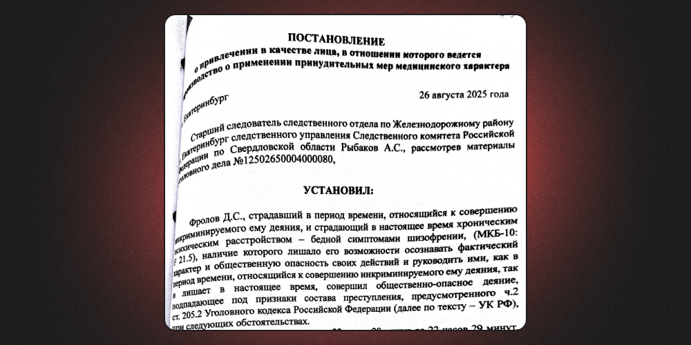 «Я так понимаю, что из-за фиктивного диагноза, который мне поставили в военкомате, после экспертизы мне поставили еще более серьезный диагноз. Я не знаю, зачем. Может быть они получают больше денег из-за количества пациентов», — говорит Фролов. Через две недели на заседании по продлению меры пресечения Данил узнал, что вместо колонии его планируют отправить на принудительное лечение.